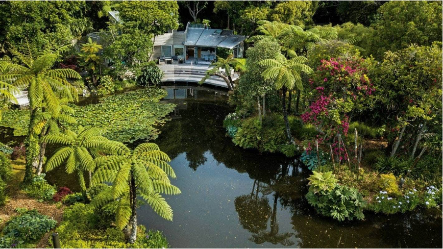They call it their ‘slice of paradise’, which of course it is, but many, many (most?) gardens are so described, and the Boffa garden is in a class of its own. It’s just over three acres (1.3ha) in area, with two-thirds of that in lush, green, covenanted forest—kohekohe, karaka, nikau—with 1,000 square metres of pond, sculpted from what was once a boggy, blackberry-infested paddock, and now clothed in a profusion of native and exotic planting.